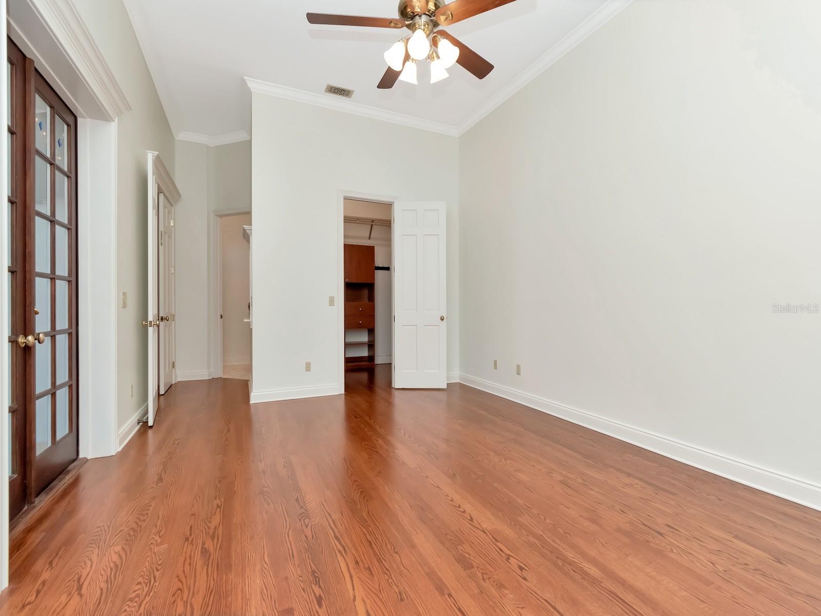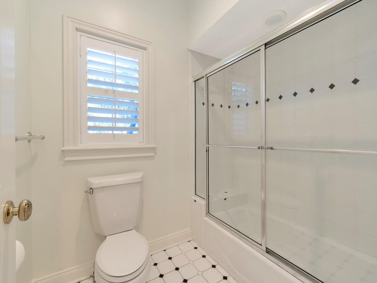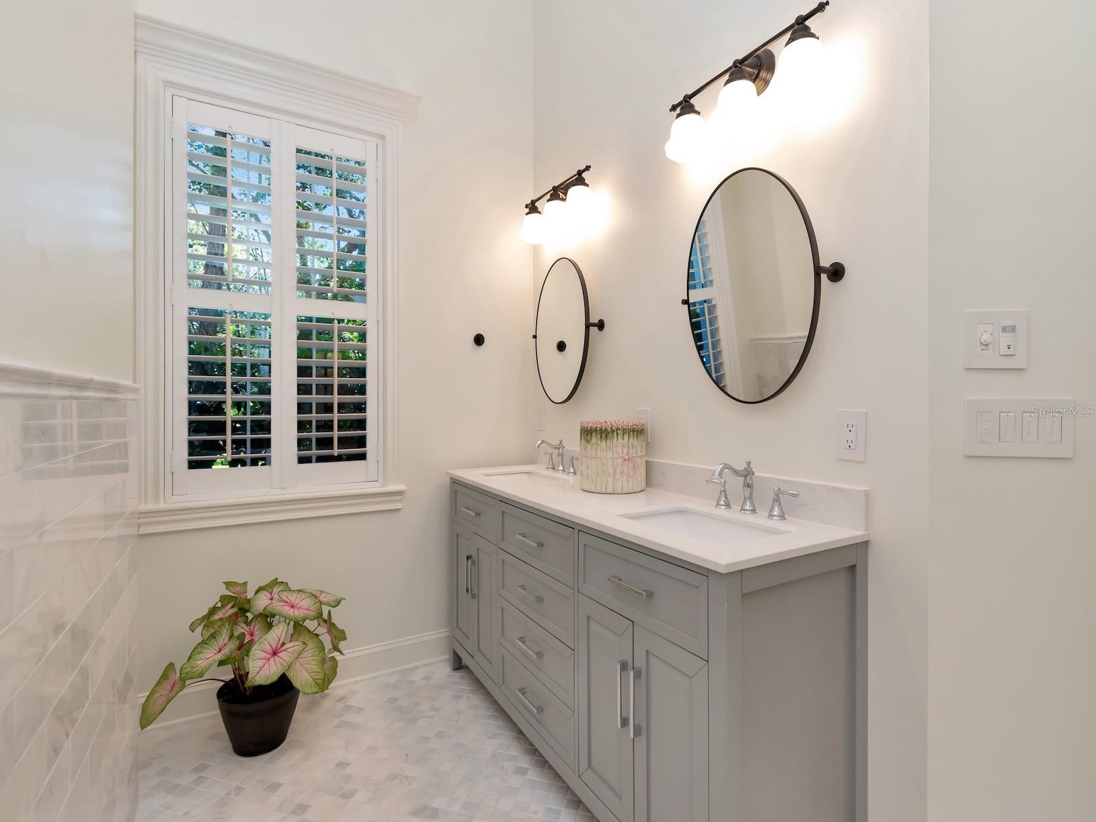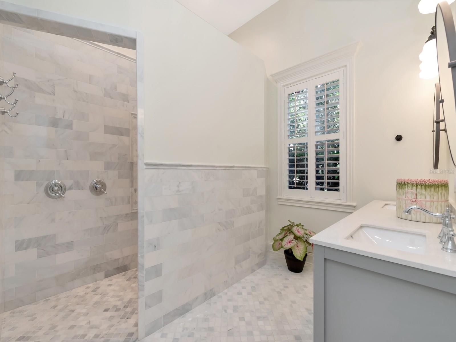 The owner's suite is a private retreat with views of the wooded grounds and pool. The newly renovated master bathroom boasts polished and honed marble finishes, and the bedroom has freshly refinished wood floors.