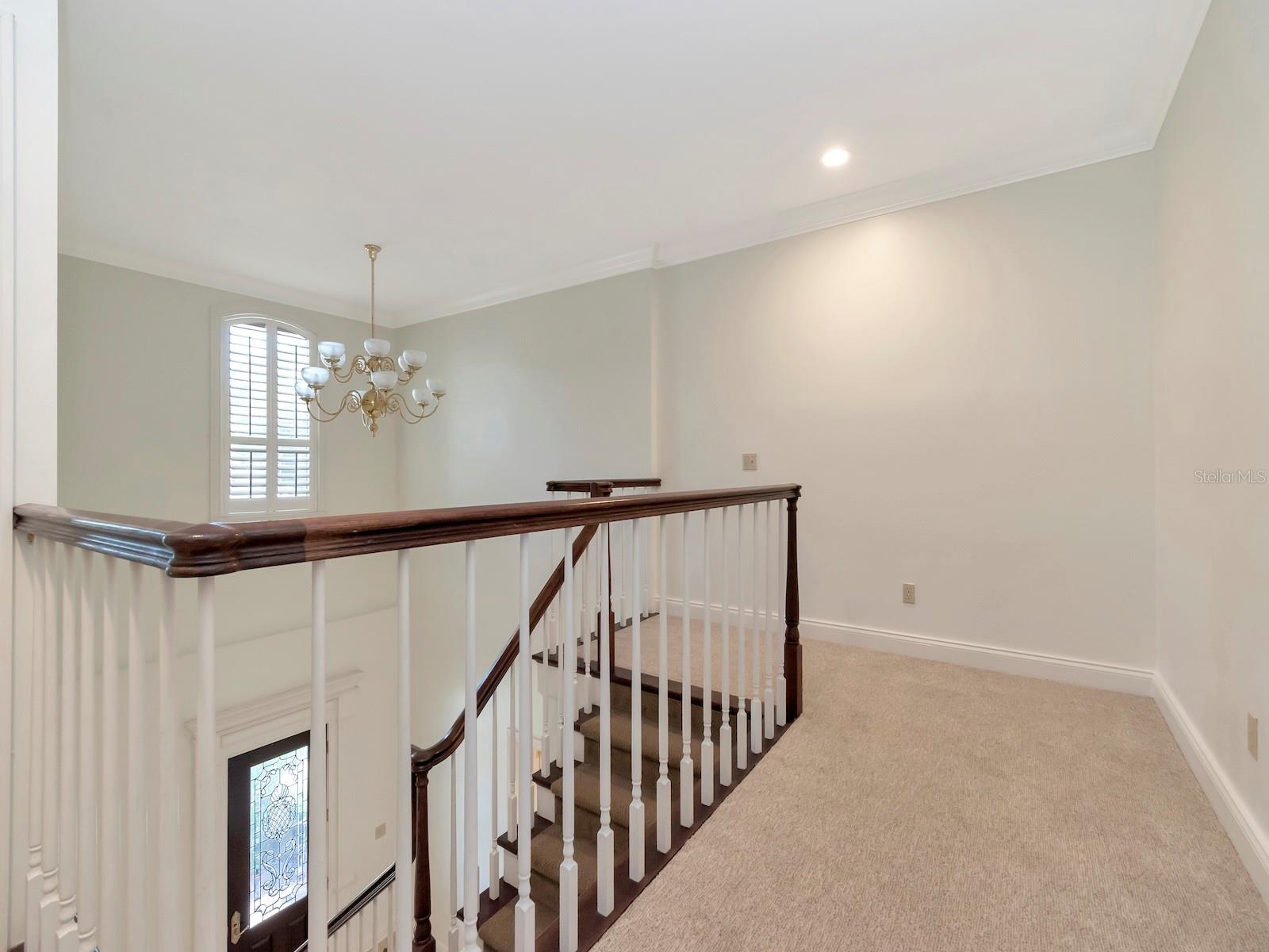 Upstairs, three additional bedrooms offer ample space, fitted closets, and plantation shutters. A walk-out balcony provides a serene spot to enjoy the surroundings.